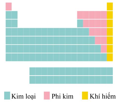 Các nguyên tố hoá học được chia thành ba loại: kim loại, phi kim và khí hiếm.