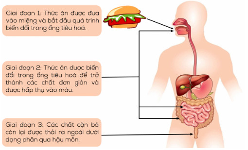 + Giai đoạn 1: Thức ăn được đưa vào miệng và bắt đầu quá trình biến đổi trong ống tiêu hóa