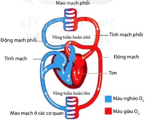 - Ở người, các chất được vận chuyển theo hai vòng tuần hoàn. Vòng tuần hoàn nhỏ đưa máu đỏ thẫm nghèo O2 từ tim đến phổi, tại đây, máu nhận O2 và thải CO2 trở thành máu đỏ tươi rồi trở về tim. Vòng tuần hoàn lớn đưa máu đỏ tươi giàu O2 và các chất dinh dưỡng đi nuôi cơ thể. Tại các tế bào, mô, cơ quan, máu nhận các chất bài tiết và CO2 trở thành máu đỏ thẫm và trở về tim.