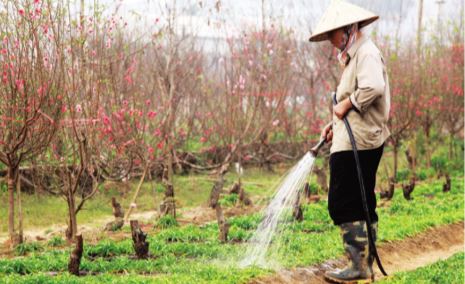 Phun nước (nước ấm hoặc nước lạnh) để điều khiển cây đào ra hoa.