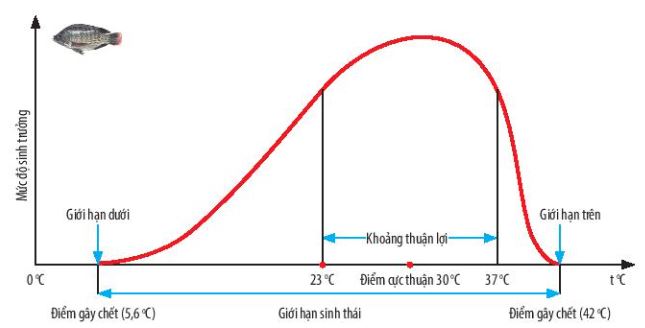 - Ảnh hưởng của nhiệt độ: Mỗi loài sinh vật thích hợp với một điều kiện nhiệt độ nhất định gọi là giới hạn sinh thái, nếu nằm ngoài giới hạn sinh thái đó thì quá trình sinh trưởng của chúng sẽ bị ảnh hưởng.