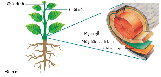 | Thực vật sinh trưởng nhờ các mô phân sinh. Mô phân sinh đỉnh có ở đỉnh của rễ và đỉnh chồi giúp thân, cành và rễ tăng lên về chiều dài. Mô phân sinh bên giúp thân, cành và rễ tăng lên về chiều ngang. |