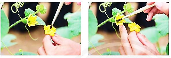 Hình 38.4. Thụ phấn nhân tạo ở dưa chuột
