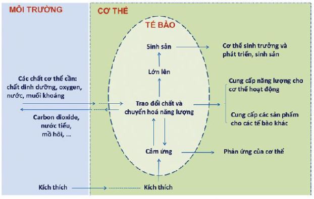 - Cơ thể trao đổi các chất với môi trường, sau đó chuyển đến tế bào để thực hiện trao đổi chất và chuyển hoá năng lượng, giúp tế bào lớn lên, sinh sản, cảm ứng. Song song với quá trình đó, các hoạt động sống được thực hiện ở cấp độ cơ thể.
