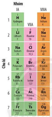 + Nhóm VIIA: gồm các nguyên tố phi kim hoạt động mạnh (trừ At, Ts). Nguyên tử của chúng đều có 7 electron ở lớp ngoài cùng. Điện tích hạt nhân tăng từ F(+9), đến Ts (+117).