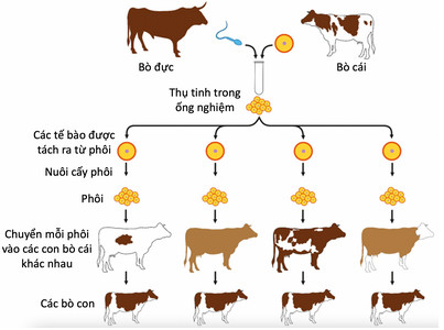 - Ví dụ, người ra đã sử dụng các hormone kích thích trứng chín và rụng, cho trứng đó thụ tinh với tinh trùng trong ống nghiệm để phát triển thành phôi, tùy từng đối tượng mà người ta đem cấy ngay phôi đó vào từ cung con cái hoặc tách phôi thành nhiều phần, mỗi phần phát triển thành một phôi mới rồi mới cấy vào tử cung của các con cái để tạo số lượng con lớn.