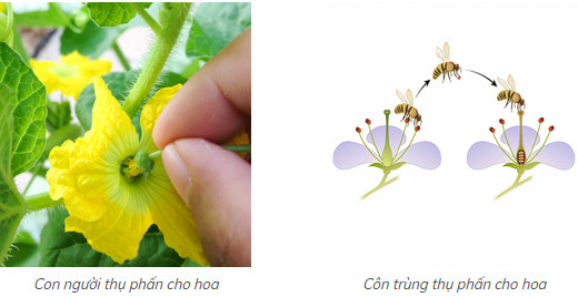 - Con người còn trực tiếp thụ phấn cho cây, đồng thời chủ động bảo vệ và phát triển các loài côn trùng thụ phấn trong tự nhiên nhằm nâng cao hiệu quả thụ phấn, giúp tăng năng suất quả và hạt. Người ta còn ngắt ngọn bầu, bí trước thời điểm cây ra hoa để phát triển nhiều chồi, nhánh giúp cây ra nhiều quả hơn hoặc dùng khói để hun cho cây dưa chuột kích thích ra nhiều hoa cái.
