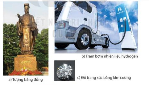 - Các chất như đồng (copper), dùng làm lõi dây điện, đúc tượng,... chỉ được tạo nên từ một nguyên tố đồng; than chì, dùng làm ruột bút chì, kim cương dùng làm đồ trang sức, mũi khoan,... chỉ được tạo nên từ một nguyên tố carbon; khí hydrogen dùng làm nhiên liệu,... chỉ được tạo nên từ một nguyên tố hydrogen (xem Hình 5.2).