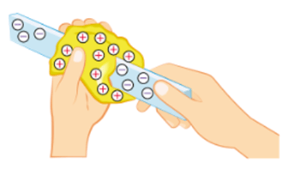 Khi cọ xát miếng vải khô vào thanh nhựa thì miếng vải nhiễm điện dương, thanh nhựa nhiễm điện âm.
