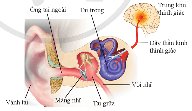 + Cấu tạo của tai gồm: Tai ngoài (gồm vành tai, ống tai ngoài), tai giữa (có màng nhĩ, chuỗi xương tai, või nhĩ) và tai trong (có ốc tai chứa các tế bào cảm thụ âm thanh).