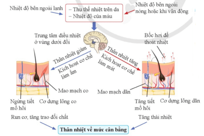 - Trung tâm điều nhiệt ở vùng dưới đồi nhận tín hiệu thân nhiệt nóng hoặc lạnh, sẽ điều khiển các quá trình sinh nhiệt và thải nhiệt thích hợp: