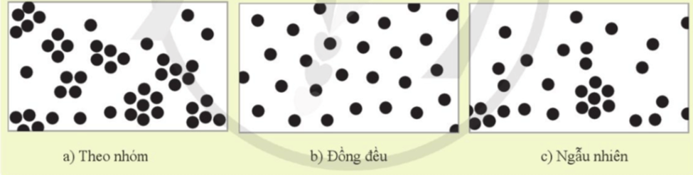 + Kiểu phân bố ngẫu nhiên: thường xuất hiện khi điều kiện sống phân bố đồng đều trong môi trường nhưng không có sự cạnh tranh gay gắt giữa các cá thể trong quần thể. Ví dụ: các loài cây gỗ sống trong rừng mưa nhiệt đới, các loài sâu sống trên tán cây, các loài sò sống trong phù sa vùng triều,…