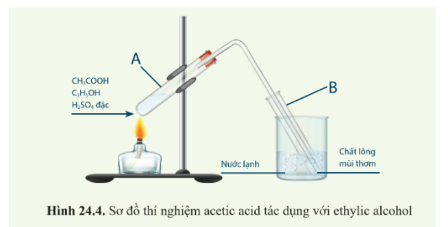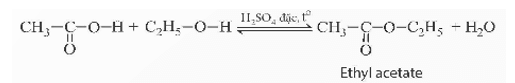 - Khi đun nóng và có H2SO4 đặc làm xúc tác, acetic acid tác dụng với ethylic alcohol tạo ra ester là ethyl acetate theo phương trình hoá học: