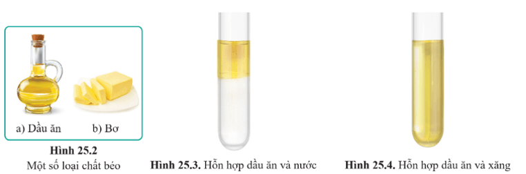 - Trong điều kiện thường, chất béo ở trạng thái lỏng (dầu) hoặc rắn (mỡ). Chất béo nhẹ hơn nước; không tan trong nước; tan trong xăng, dầu hỏa, benzene,…
