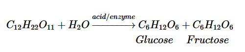 - Ở nhiệt độ thích hợp, khi có mặt acid hoặc enzyme làm xúc tác, saccharose sẽ tác dụng với nước tạo thành glucose và fructose theo phương trình hoá học sau: