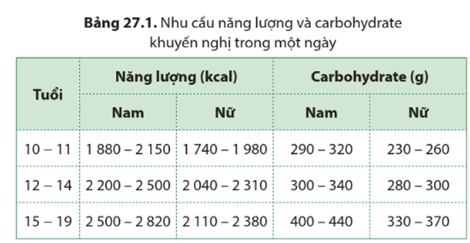 - Tinh bột và các loại đường cung cấp phần lớn năng lượng cho con người. Tổng lượng carbohydrate cần thiết trong khẩu phần ăn hằng ngày đối với một người được trình bày trong bảng: