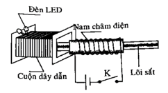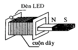 Câu 11: Cho một cuộn dây dẫn mà hai đầu nối với bóng đèn LED và một thanh nam châm vĩnh cửu. Bố trí thí nghiệm như hình bên. Khi đưa nam châm vào trong lòng cuộn dây thì thấy đèn LED sáng.