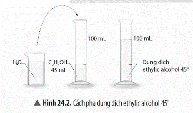 Ví dụ: Để có dung dịch ethylic alcohol 45oC (45% Vol), ta thêm từ từ nước vào ống đong có chữa sẵn 45 mL ethylic alcohol nguyên chất cho đến khi được 100 mL dung dịch rồi khuấy đều.