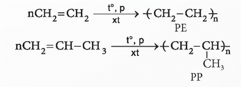 PE và PP được tạo ra từ ethylene và propylene theo các phương trình hoá học sau: