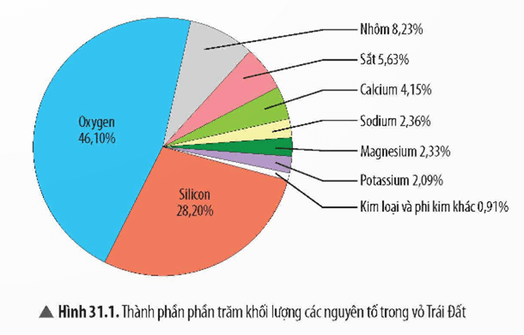 - Vỏ Trái Đất chứa nhiều khoáng chất được tạo nên từ các nguyên tố như oxygen, silicon, sắt, magnesium, nhôm,… Trong số các nguyên tố đó, oxygen và silicon là những nguyên tố có hàm lượng lớn trong vỏ Trái Đất.
