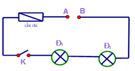 Khi công tắc K mở thì hai đèn không hoạt động vì mạch hở không có dòng điện chạy qua hai đèn.