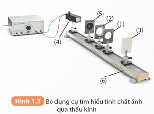 Bộ dụng cụ tìm hiểu tính chất ảnh qua thấu kính: - Thấu kính hội tụ (1) - Thấu kính phân kì (2) - Màn chắn (3) - Đèn (4) - Khe hình chữ F (5) - Giá quang học đồng trục (6)