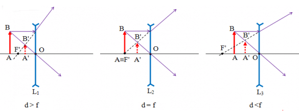 - Từ B’ hạ vuông góc với trục chính, cắt trục chính tại A’, ta thu được ảnh A’B’ của vật.