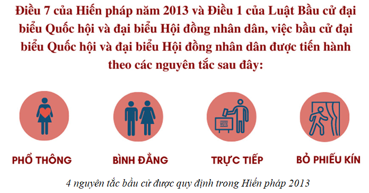Việc bầu cử đại biểu Quốc hội, Hội đồng nhân dân các cấp được tiến hành theo nguyên tắc: phổ thông, bình đẳng, trực tiếp và bỏ phiếu kín.