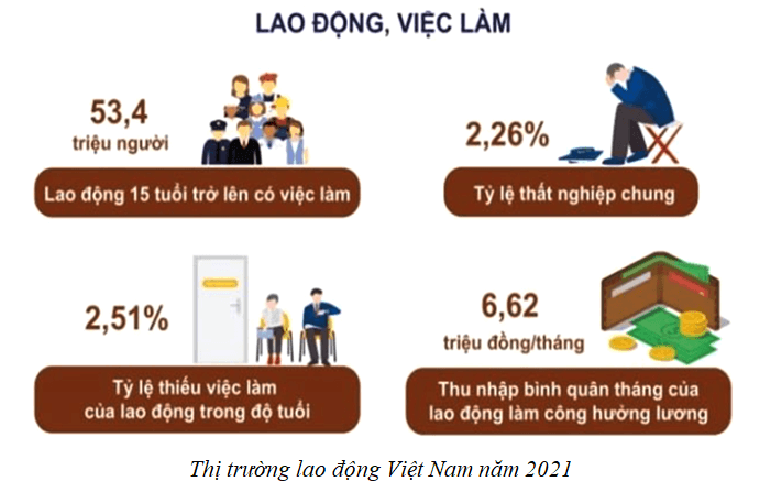 - Trong năm 2021, trên thị trường Việt Nam có sự chênh lệch giữa cung - cầu lao động, theo hướng: nguồn cung lao động lớn hơn so với nhu cầu tuyển dụng việc làm => sự chênh lệch giữa cung - cầu lao động này đã dẫn tới việc: 3,2% lực lượng lao động trong độ tuổi bị thất nghiệp và 3,1% người lao động trong độ tuổi thiếu việc làm.