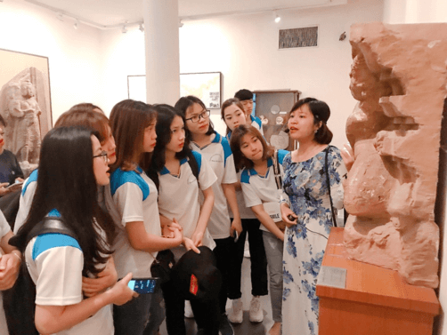 Hướng dẫn viên giới thiệu hiện vật tại bảo tàng Lịch sử quốc gia