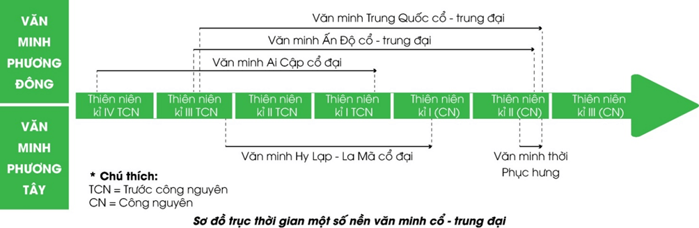 - Ở phương Đông, văn minh Ai Cập và Lưỡng Hà chỉ tồn tại ở thời cổ đại; đến thời trung đại, văn minh Ấn Độ và Trung Hoa tiếp tục được phát triển đến khi bị các nước thực dân phương Tây xâm lược và đô hộ (cuối thế kỉ XIX)