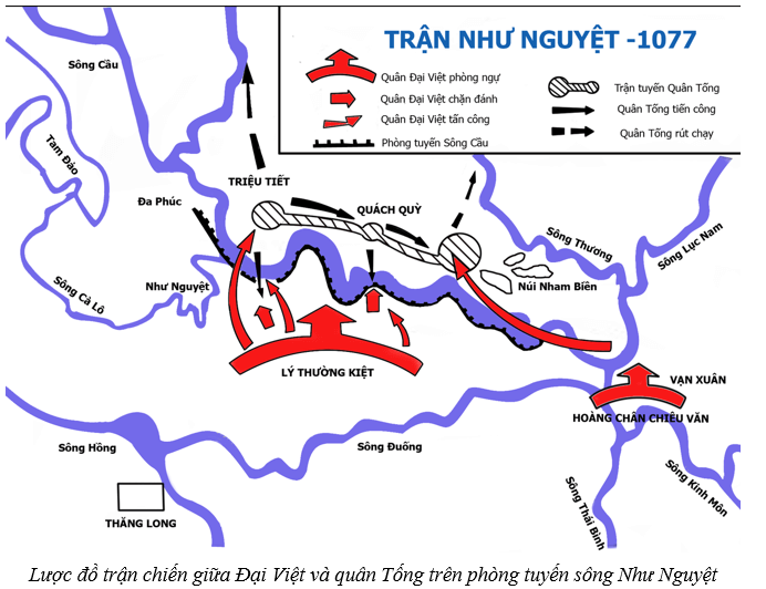 - Đầu năm 1076, hàng chục vạn quân Tống chia làm hai đạo tiến vào Đại Việt và bị chặn lại ở phòng tuyến bên bờ sông Như Nguyệt (Bắc Ninh ngày nay). Quân Tống nhiều lần tổ chức vượt sông đánh sang phòng tuyến của quân nhà Lý nhưng thất bại.
