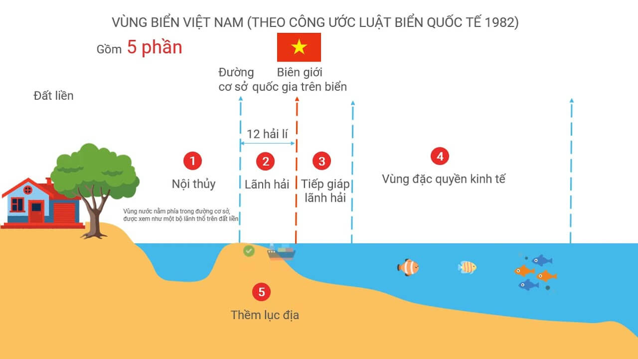 - Theo Công ước, các quốc gia ven biển (kể cả các quốc gia quần đảo) có 5 vùng biển như sau: vùng nội thuỷ, vùng lãnh hải, vùng tiếp giáp lãnh hải, vùng đặc quyền kinh tế, vùng thềm lục địa (kể cả thềm lục địa kéo dài). Tuỳ theo đặc điểm và cấu tạo địa lí mà quốc gia ven biển có đầy đủ 5 vùng biển.