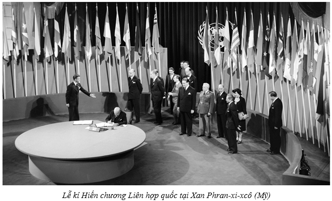 + Từ 25-4 đến 26-6-1945: Đại diện 50 nước họp tại Xan Phran-xi-xcô (Mỹ) thông qua Hiến chương Liên hợp quốc.