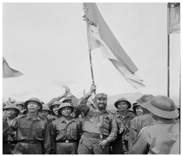 Lãnh đạo Cu-ba Phi-đen Cát-xtơ-rô phất cao lá cờ của quân Giải phóng tại Cao điểm 241, ngày 16-9-1973