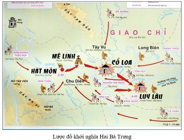 - Lược đồ trên thể hiện diễn biến chính của cuộc khởi nghĩa Hai Bà Trưng: