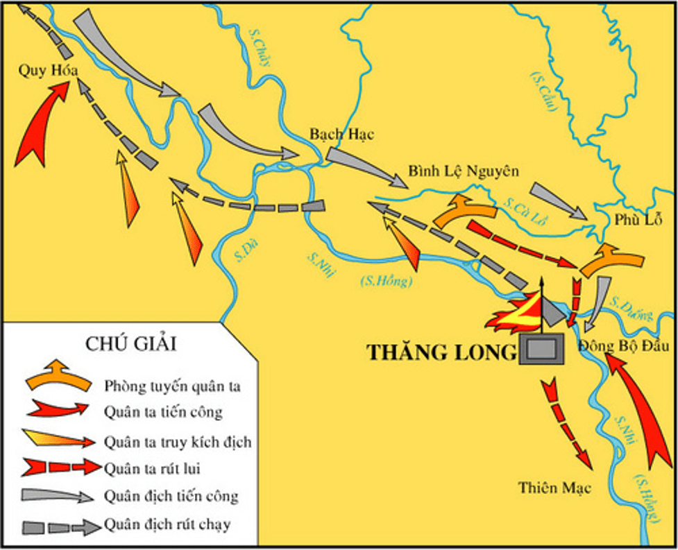 + Trước tình cảnh khó khăn của quân giặc, nhà Trần mở cuộc tấn công quyết định vào Đông Bộ Đầu (Hà Nội ngày nay). Quân Mông Cổ thua trận, rút chạy khỏi Thăng Long, đến phủ Quy Hóa lại bị dân bình đại phương chặn đánh.