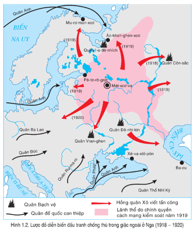 - Trong bối cảnh đó, chính quyền Xô viết xây dựng lực lượng quân đội đông đảo và thực hiện chính sách Cộng sản thời chiến (1919). Đến năm 1920, cuộc chiến đấu chống thù trong giặc ngoài của nhân dân Nga Xô viết về cơ bản kết thúc thắng lợi.