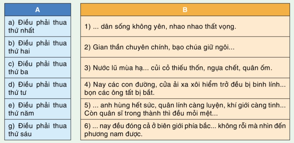 Câu 2: Bức thư của Nguyễn Trãi chỉ ra sáu điều phải thua của quân Minh. Em hãy điền những nội dung còn thiếu ở cột B rồi ghép thứ tự điều phải thua ở cột A với các nội dung Ở cột B sao cho chính xác.