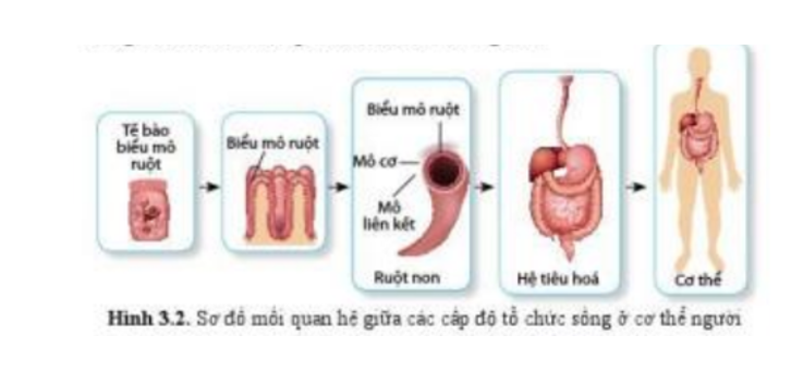 Các cấp độ tổ chức tạo nên hệ tiêu hóa trong cơ thể người là: tế bào biểu mô ruột → biểu mô ruột → ruột non → hệ tiêu hóa. Trong đó, tế bào biểu mô ruột thực hiện chức năng hấp thụ chất dinh dưỡng, nhờ đó ruột non và hệ tiêu hóa thực hiện được chức năng tiêu hóa và hấp thụ dinh dưỡng của cơ thể người.