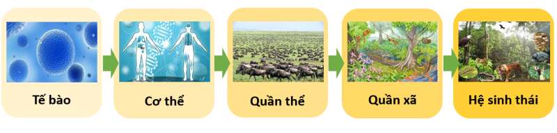 Các cấp độ tổ chức sống cơ bản gồm: tế bào, cơ thể, quần thể, quần xã – hệ sinh thái.