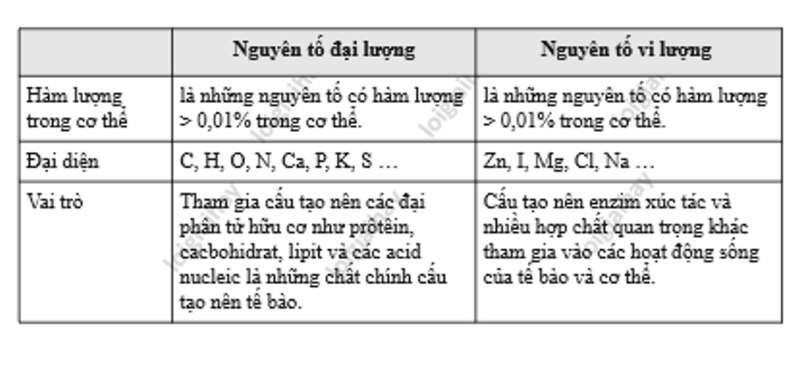 Dựa vào tỉ lệ phần trăm khối lượng cơ thể, các nguyên tố trong cơ thể sinh vật được chia thành hai nhóm là: đại lượng và vi lượng.