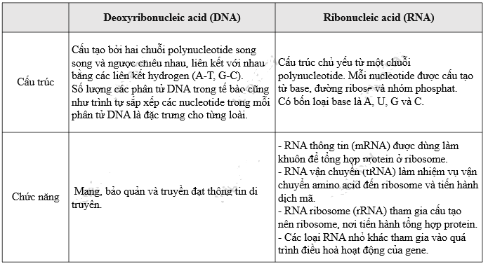 Câu 12: Phát biểu nào sau đây là đúng khi nói về điểm khác nhau giữa DNA và RNA?