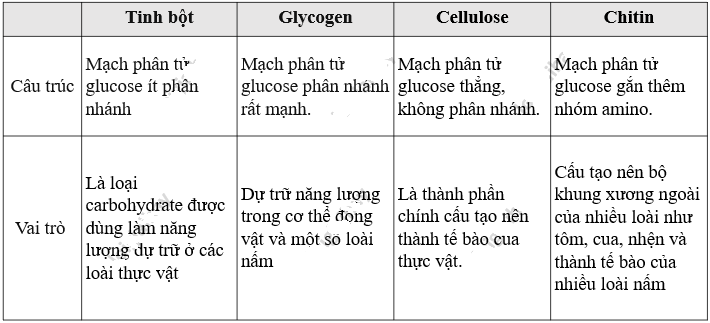 Glycogen dự trữ năng lượng trong tế bào, cellulose là thành phần chính của thành tế bào.