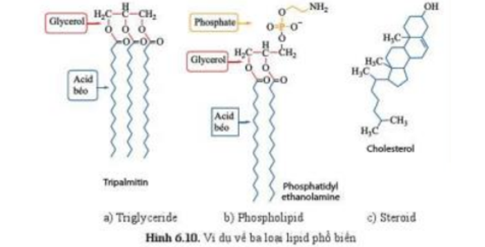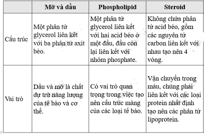 (a) đóng vai trò dự trữ năng lượng trong tế bào và cơ thể đồng thời là dung môi hoà tan nhiều vitamin như A, D, E, K. (b) tham gia cấu tạo màng sinh chất và điều hoà tính lỏng của màng ở tế bào động vật. (c) tham gia điều hòa sự trao đổi chất, sinh trưởng và sinh sản của cơ thể. (d) là thành phần chính cấu tạo nên màng sinh chất. |