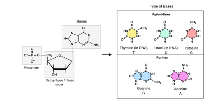 Mỗi nucleotide được cấu tạo bởi 3 thành phần: 1 đường pentose (deoxyribose và ribose) + 1 nitrogenous base (A, G, T, C, U) + 1 gốc phosphate.