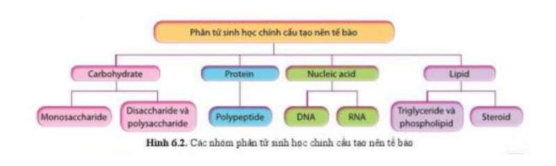 Nhóm phân tử sinh học lớn tham gia cấu tạo tế bàolà: Carbohydrate, protein, nucleic acid, lipid.