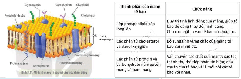 Mô hình cấu trúc màng tế bào gọi là mô hình khảm lỏng với nhiều thành phần, mỗi thành phần đảm nhận các chức năng riêng biệt: