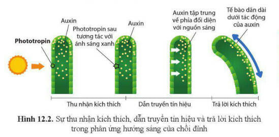 Phản ứng của thực vật đối với các tín hiệu môi trường diễn ra thông qua các quá trình: thu nhận kích thích, dẫn truyền tín hiệu và trả lời kích thích (hình 12.2).