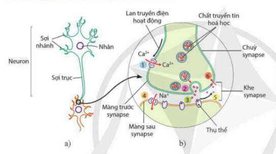 - Một neuron điển hình có cấu tạo gồm các phần: phần thân chứa nhân và các bào quan, các sợi nhánh là tua ngắn bao quanh thân và sợi trục dài. Neuron có các vai trò chính là: hình thành xung thần kinh, dẫn truyền xung thần kinh, phối hợp xử lí và lưu trữ thông tin.